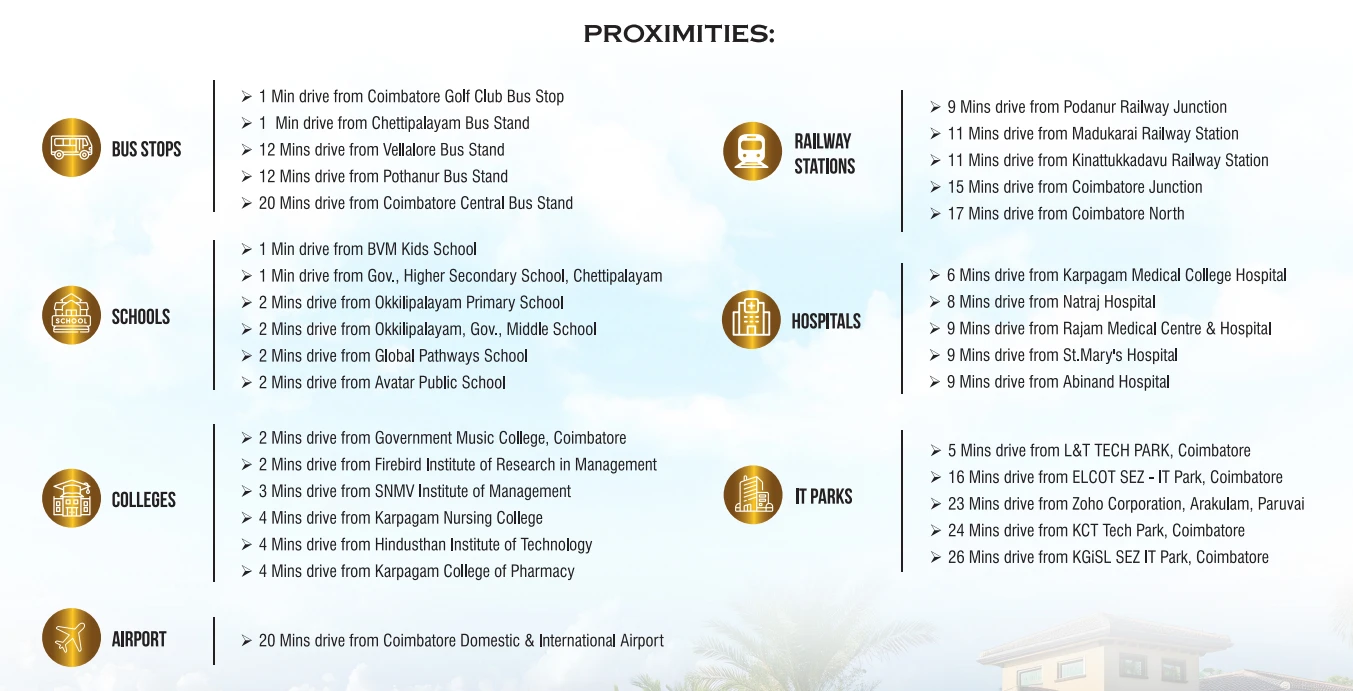 Chettipalayam is one of Coimbatore’s fastest-developing residential zones. The location is ideal for homebuyers and investors who want a quiet environment while staying close to essential infrastructure. It offers quick access to: